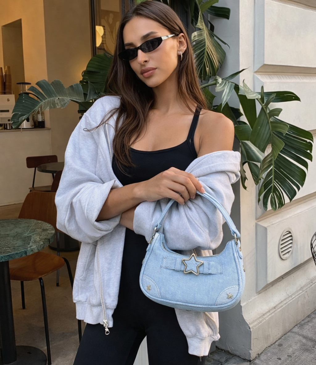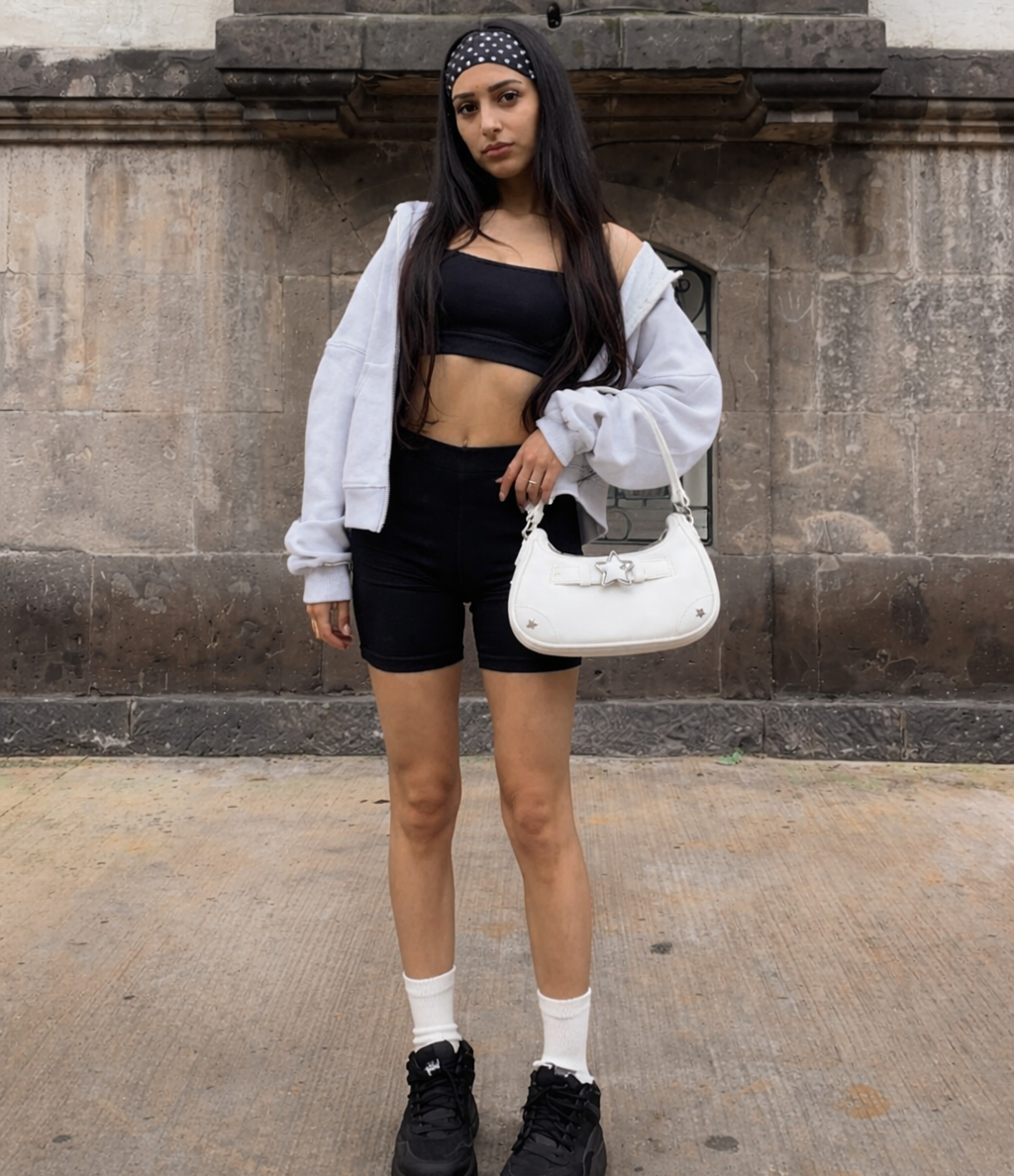 Sac à main compact en simili cuir noir brillant, au design urbain et structuré.